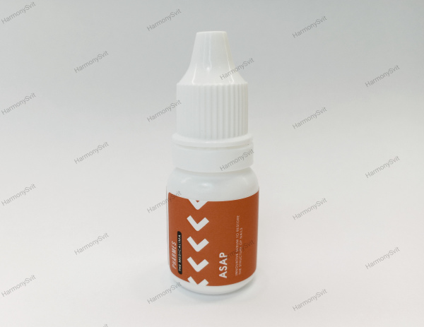 ASAP - інноваційний професійний препарат для відновлення, зміцнення та лікування нігтів. Низькомолекулярний флюїд містить 22 високоактивні компоненти, які проникають углиб нігтя і працюють зсередини. Препарат комплексно впливає на нігтьову пластину, кутикулу та навколонігтьові валики. Засіб скріплює між собою шари нігтьової пластини з піднігтьовими якірними зв'язками, роблячи її міцнішою і гнучкішою. Система активно усуває розшарування, відколи, тріщини, ламкість, білі плями та інші можливі ушкодження, а також допомагає швидкому зростанню здорових нігтів. ASAP - стимулює ріст і відновлює пошкоджену структуру нігтьової пластини, підвищує стійкість шкіри та нігтів до несприятливих впливів зовнішнього середовища, має протизапальну, регенеруючу, протигрибкову та протиінфекційну дію. Препарат міцно склеює зруйновані рогові шари нігтя. При розподілі та пенетрації молекулярна структура засобу змінюється та проникає глибоко всередину нігтьової пластини. Ліпосоми, що містяться в складі, пептиди і низькомолекулярні масла розкривають лусочки рогового шару, під дією перекристалізації, всередині створюється міцна кристалічна решітка. Щоденне використання флюїду сприяє відновленню нігтьової пластини при механічних, хімічних та мікробіологічних ушкодженнях. Захищає ніготь та шкіру навколонігтьових валиків від інфекційних захворювань. Перешкоджає утворенню задирок та огрубінню кутикули. Ф-д ASAP (АСАП) - це принципово новий препарат, який відрізняється від усіх відновлювальних засобів. Система працює неймовірно швидко . Процес відновлення відбувається глибоко усередині нігтьової пластини. Низькомолекулярний склад проникає у найглибші шари тканини, а ліпосомні мембрани поступово вивільняють високоактивні речовини, які зберігають свої позитивно заряджені частинки та постійно живлять клітини. Внутрішня дія є основною відмінністю ASAP від інших відновлювальних і зміцнюючих препаратів, які можна знайти на ринку. Високоактивні речовини проникають углиб нігтьової пластини та стають частиною натурального нігтя. Препарат розроблений як фармацевтично активна біологічна система для відновлення нігтів і нігтьових зв'язок, скріплює між собою шари нігтьової пластини (дорсальний, проміжний та вентральний шари) з матриксом, гіпоніхієм та якірними елементами.